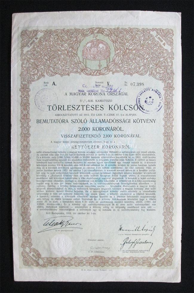 ÉrtesítésekÉrtesítés a frissítésekről Államadóssági kötvény törlesztéses kölcsön 2000 korona 1916