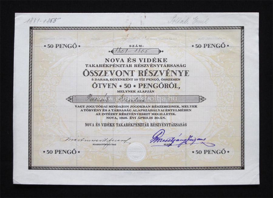 ÉrtesítésekÉrtesítés a frissítésekről Nova és Vidéke Takarékpénztár részvény 5x10 pengő 1928