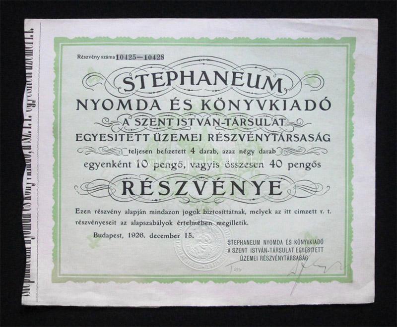 ÉrtesítésekÉrtesítés a frissítésekről Stephaneum Nyomda - Szent István Társulat részvény 4x10 pengő 1926