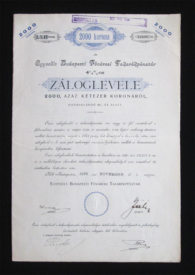 ÉrtesítésekÉrtesítés a frissítésekről Egyesült Budapesti Fővárosi Takarékpénztár záloglevél 2000k 1920