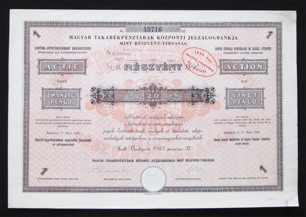 Magyar Takarékpénztárak Központi Jelzálogbankja részvény 20 pengő 1943