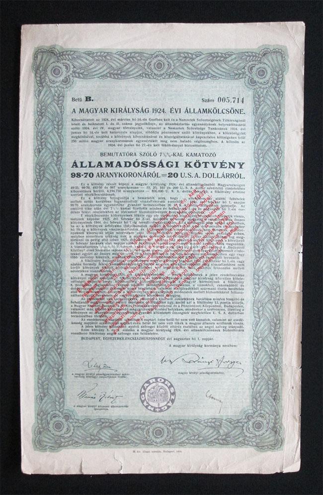 ÉrtesítésekÉrtesítés a frissítésekről Magyar Királyság Államkölcsöne 20 USA dollár 1924