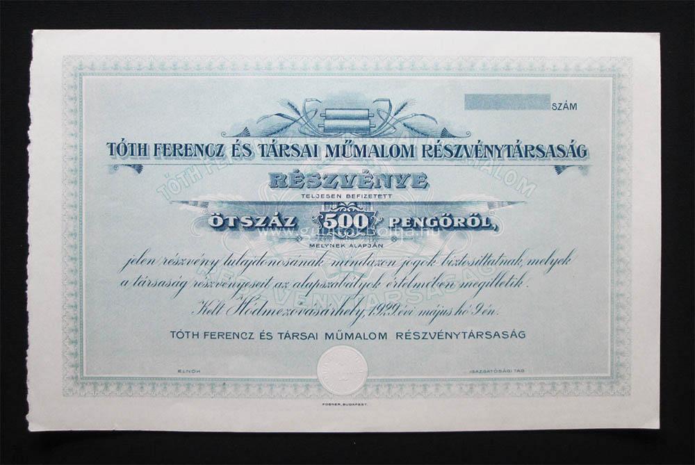 Tóth Ferenc és Társai Műmalom Részvénytársaság részvény 500 pengő 1929 - Hódmezővásárhely