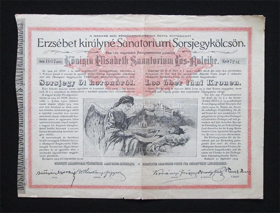 ÉrtesítésekÉrtesítés a frissítésekről Erzsébet királyné Sanatorium Sorsjegykölcsön 5 korona 1904