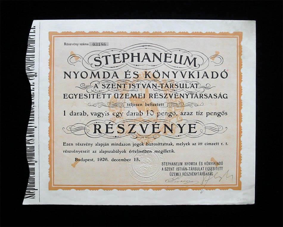 Stephaneum Nyomda - Szent István Társulat részvény 10 pengő 1926