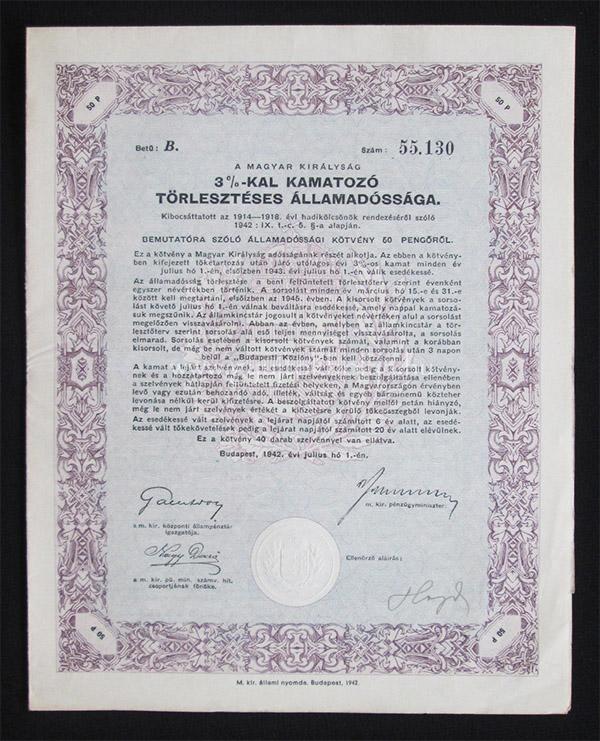 Államadóssági Kötvény Járadékkölcsön 50 pengő 1942