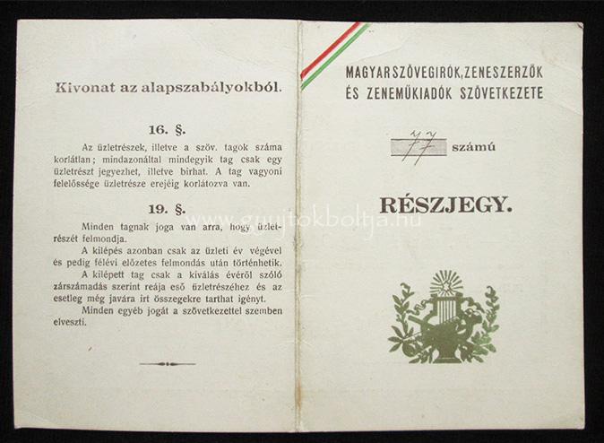Magyar Szövegírók, Zeneszerzők és Zeneműkiadók Szövetkezete Korlátolt Felelősséggel részjegy 24 pengő 1926