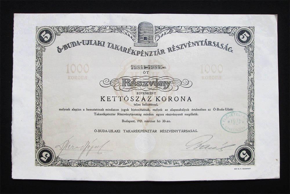 Óbuda-Újlaki Takarékpénztár Részvénytársaság részvény 5 x 200 korona 1921
