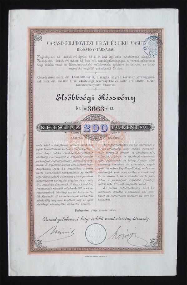 Varasd-Goluboveczi Helyi Érdekű Vasút Részvénytársaság elsőbbségi részvény 200 forint 1889 (CRO)