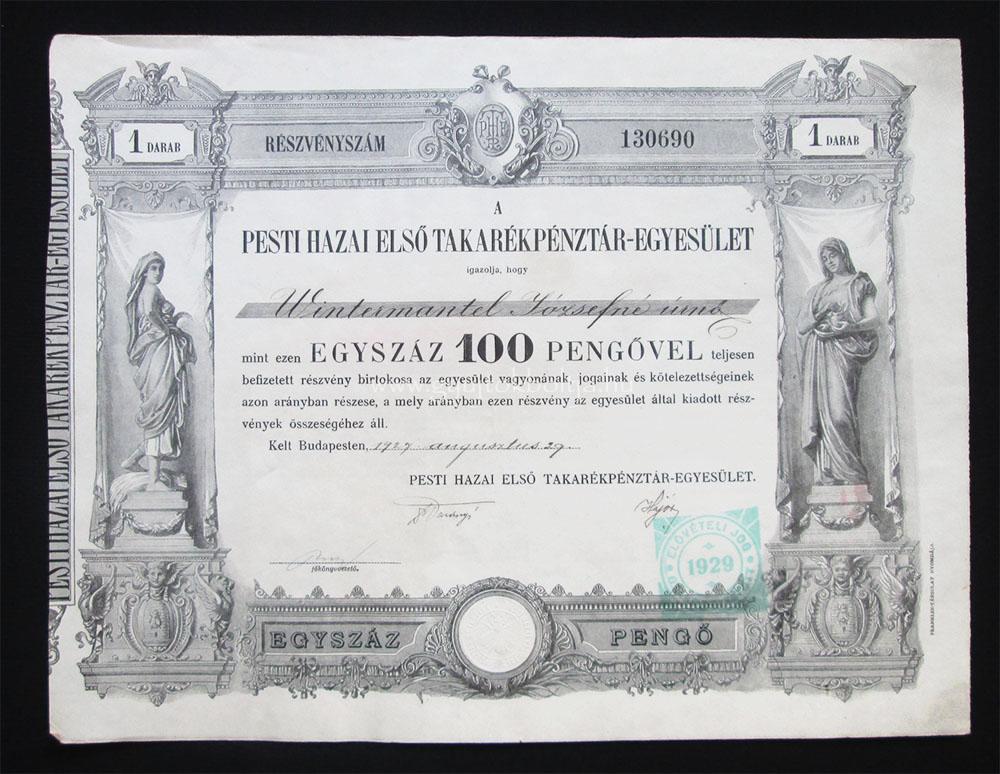 Pesti Hazai Első Takarékpénztár-Egyesület Részvénytársaság részvény 100 pengő 1927