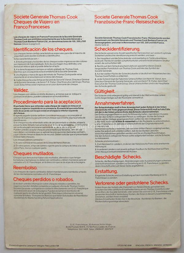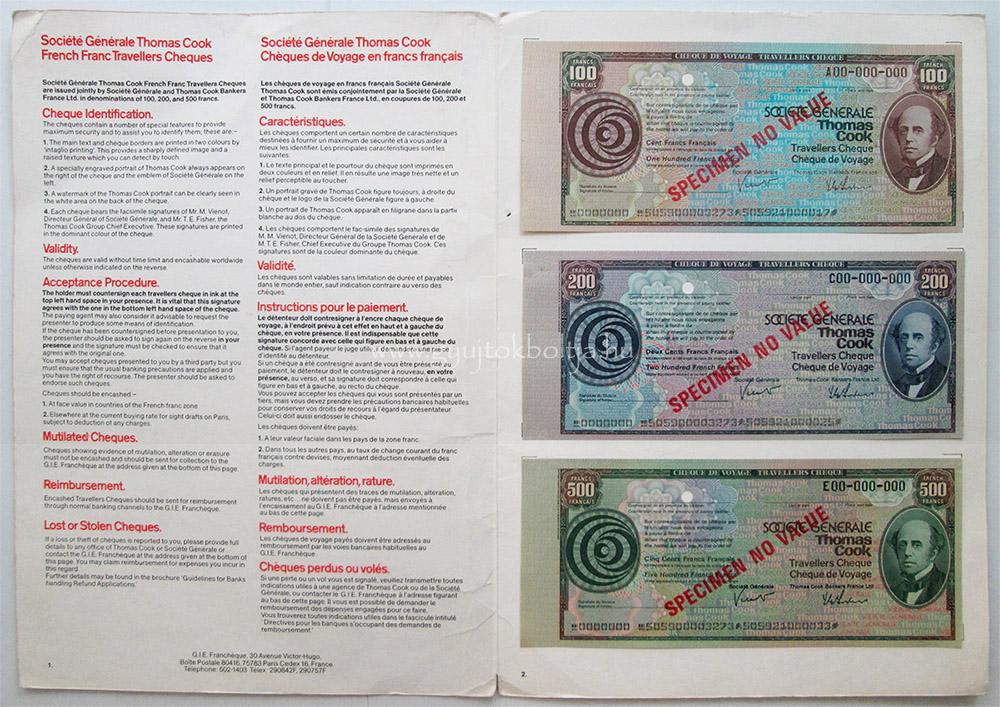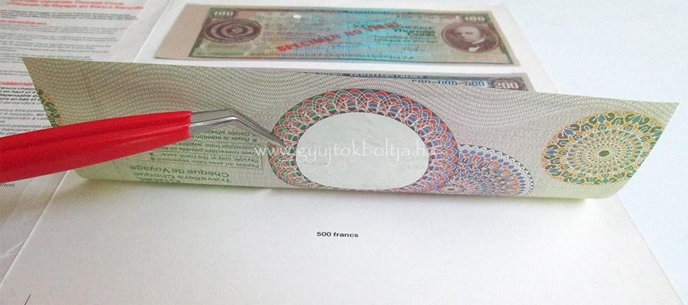 A Societe Generale és a Thomas Cook Bankers France Ltd. által kibocsátott 100-200-500 frank címletű utazási csekk SPECIMEN sorozat 1978-ból. Mindegyik nyomat vízjeles papírra, réznyomással, 0-ás sorszámmal, SPECIMEN felülbélyegzéssel készült.