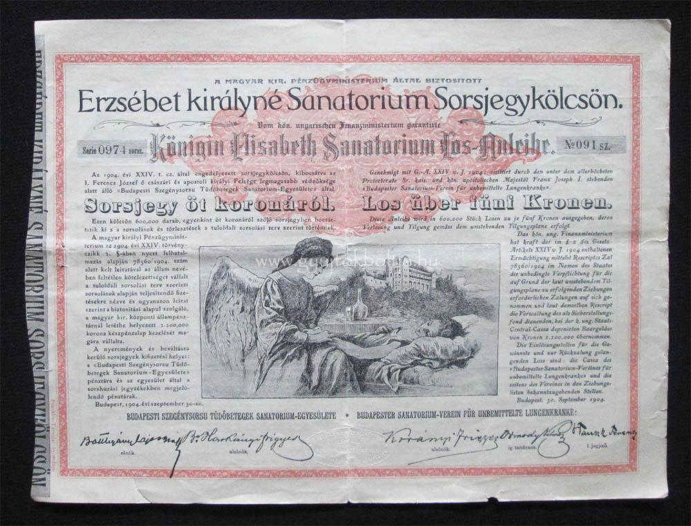 ÉrtesítésekÉrtesítés a frissítésekről Erzsébet királyné Sanatorium Sorsjegykölcsön 5 korona 1904
