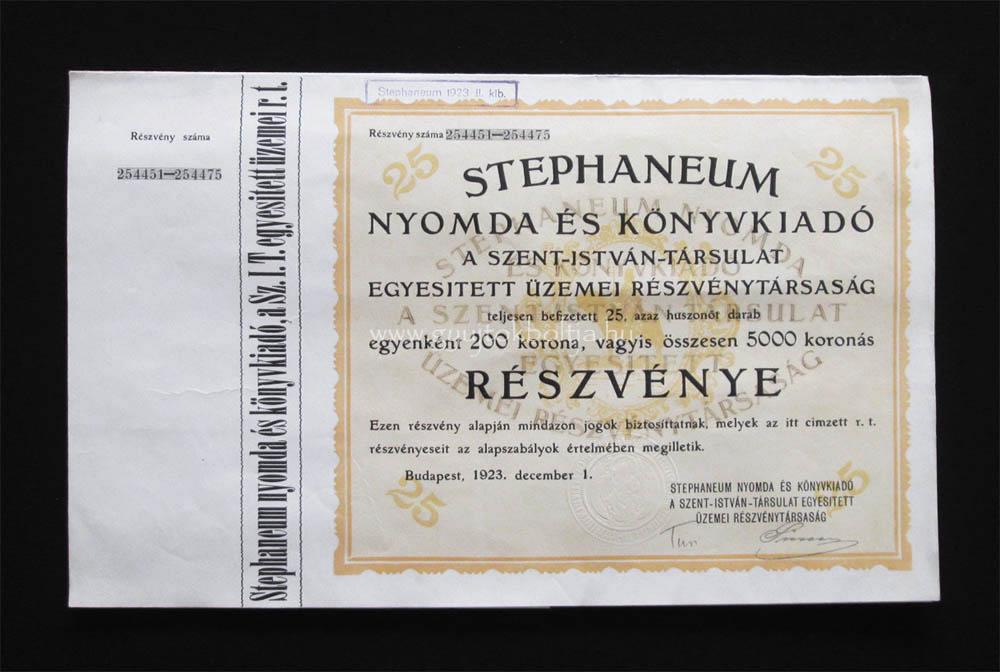 Stephaneum Nyomda - Szent István Társulat részvény 25x200 korona 1923